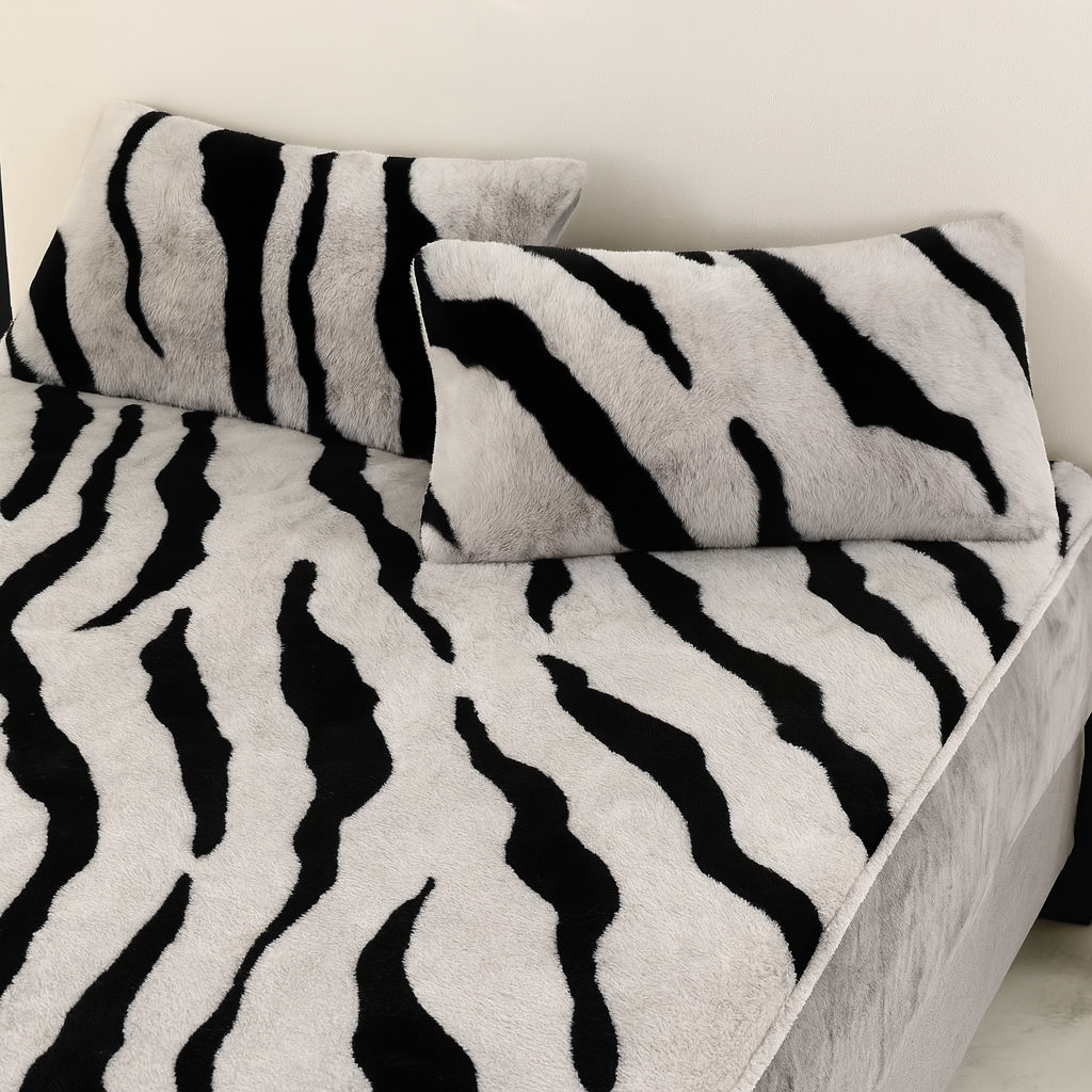 Această husă de pat este realizată din blăniță de iepure artificială, oferind un aspect luxuriant și o textură moale, plăcută la atingere. Modelul modern, cu imprimeu stilizat în nuanțe de roz și negru, adaugă un plus de eleganță și rafinament dormitorului.
