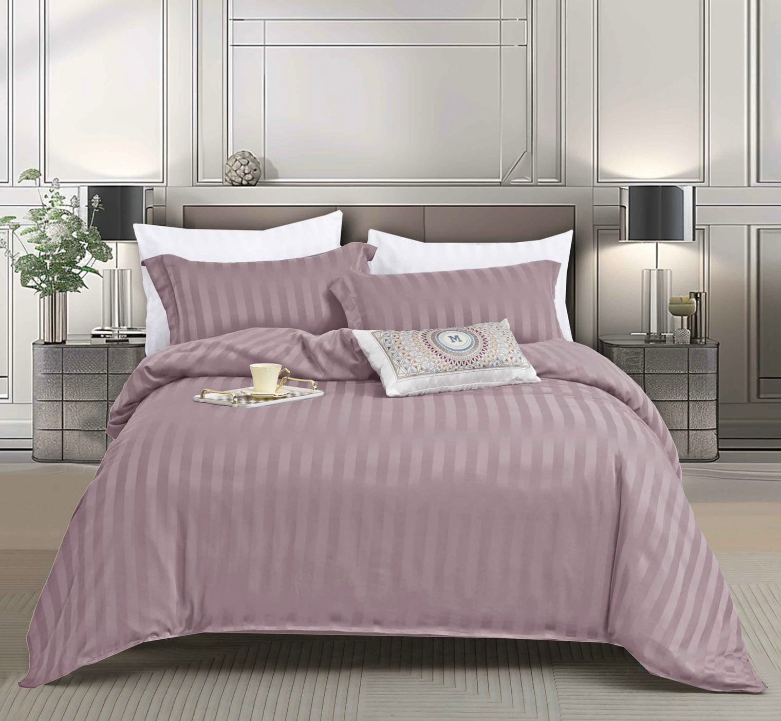 Lenjerie de pat dublu din damasc finetat, lineae (tesatura cu dungi ), confectionata din bumbac 100%, cu 6 piese, folosita cel mai mult in regimul hotelier, datorita simplitatii si calitatii extraordinare. Materialul are un aspect mat pentru o nota de eleganta si rafinament, datorita tesaturii speciale. Damascul este recunoscut pentru rezistenta sa in timp la nenumarate spalari, nemodificandu-si aspectul.