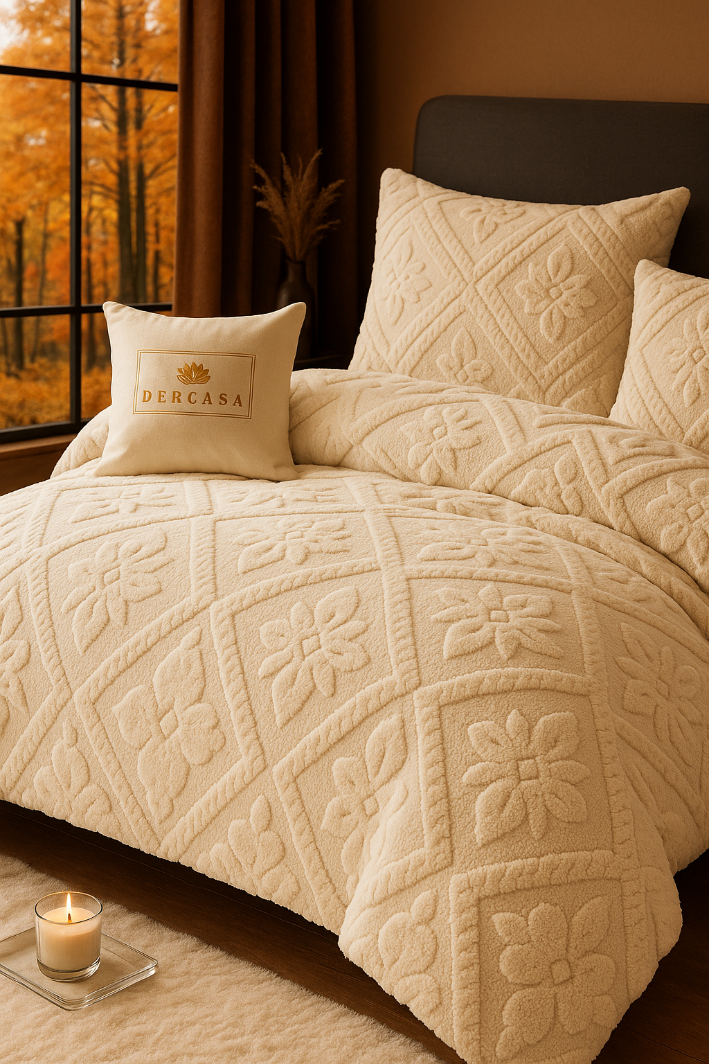 Transformă-ți dormitorul într-un spațiu cald și rafinat cu acest set de lenjerie DERCASA, confecționat din materiale moi, plăcute la atingere și cu un design elegant în relief floral. Textura sa catifelată oferă un plus de confort și stil, perfectă pentru serile reci petrecute lângă șemineu.