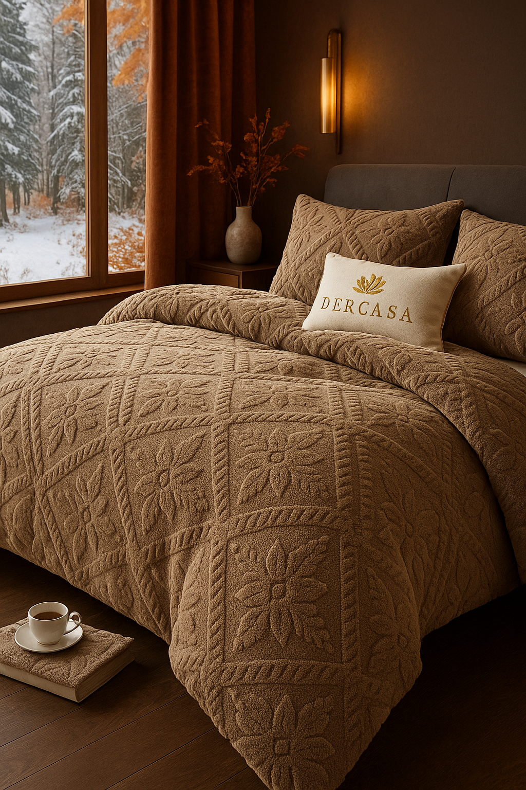 Transformă-ți dormitorul într-un spațiu cald și rafinat cu acest set de lenjerie DERCASA, confecționat din materiale moi, plăcute la atingere și cu un design elegant în relief floral. Textura sa catifelată oferă un plus de confort și stil, perfectă pentru serile reci petrecute lângă șemineu.