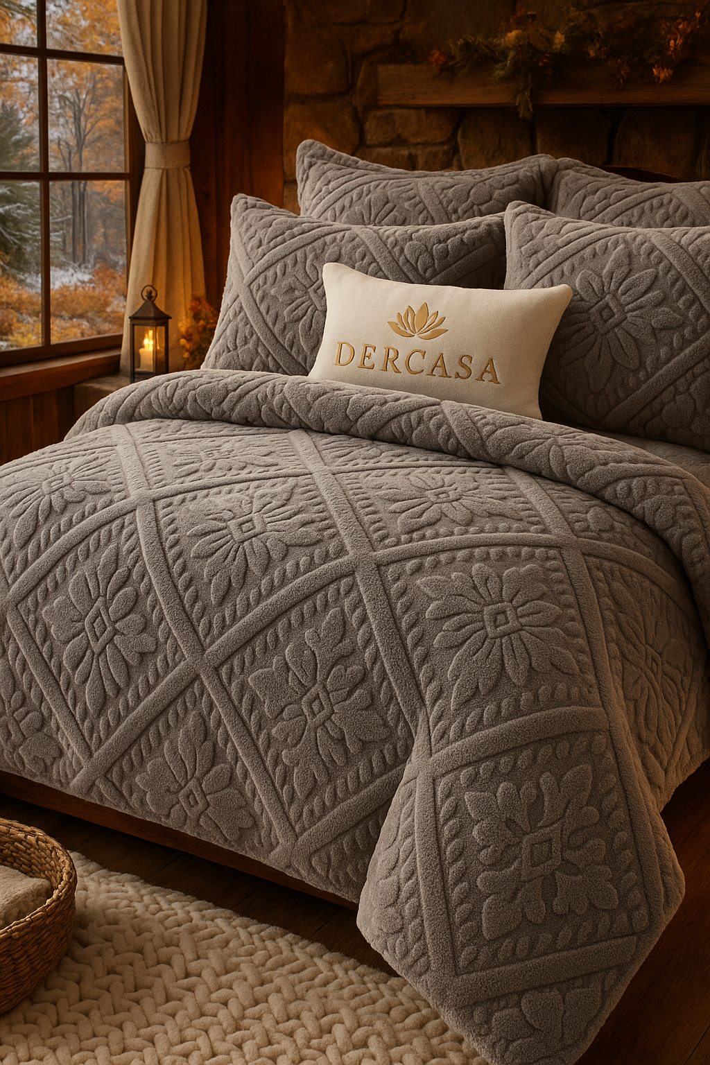 Transformă-ți dormitorul într-un spațiu cald și rafinat cu acest set de lenjerie DERCASA, confecționat din materiale moi, plăcute la atingere și cu un design elegant în relief floral. Textura sa catifelată oferă un plus de confort și stil, perfectă pentru serile reci petrecute lângă șemineu.