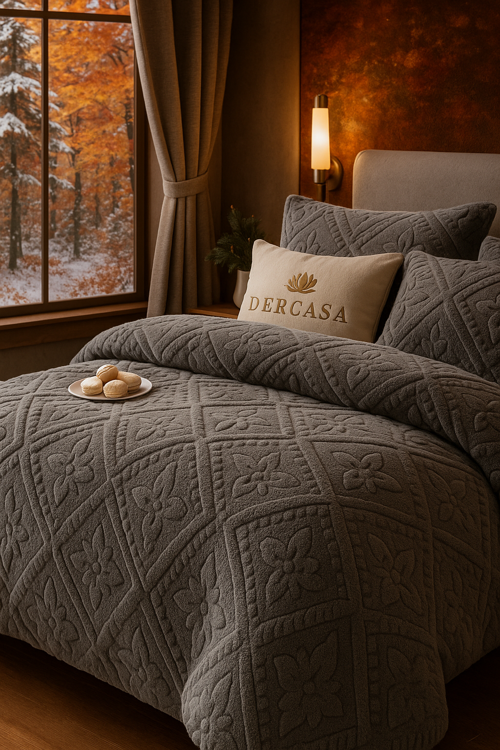 Transformă-ți dormitorul într-un spațiu cald și rafinat cu acest set de lenjerie DERCASA, confecționat din materiale moi, plăcute la atingere și cu un design elegant în relief floral. Textura sa catifelată oferă un plus de confort și stil, perfectă pentru serile reci petrecute lângă șemineu.