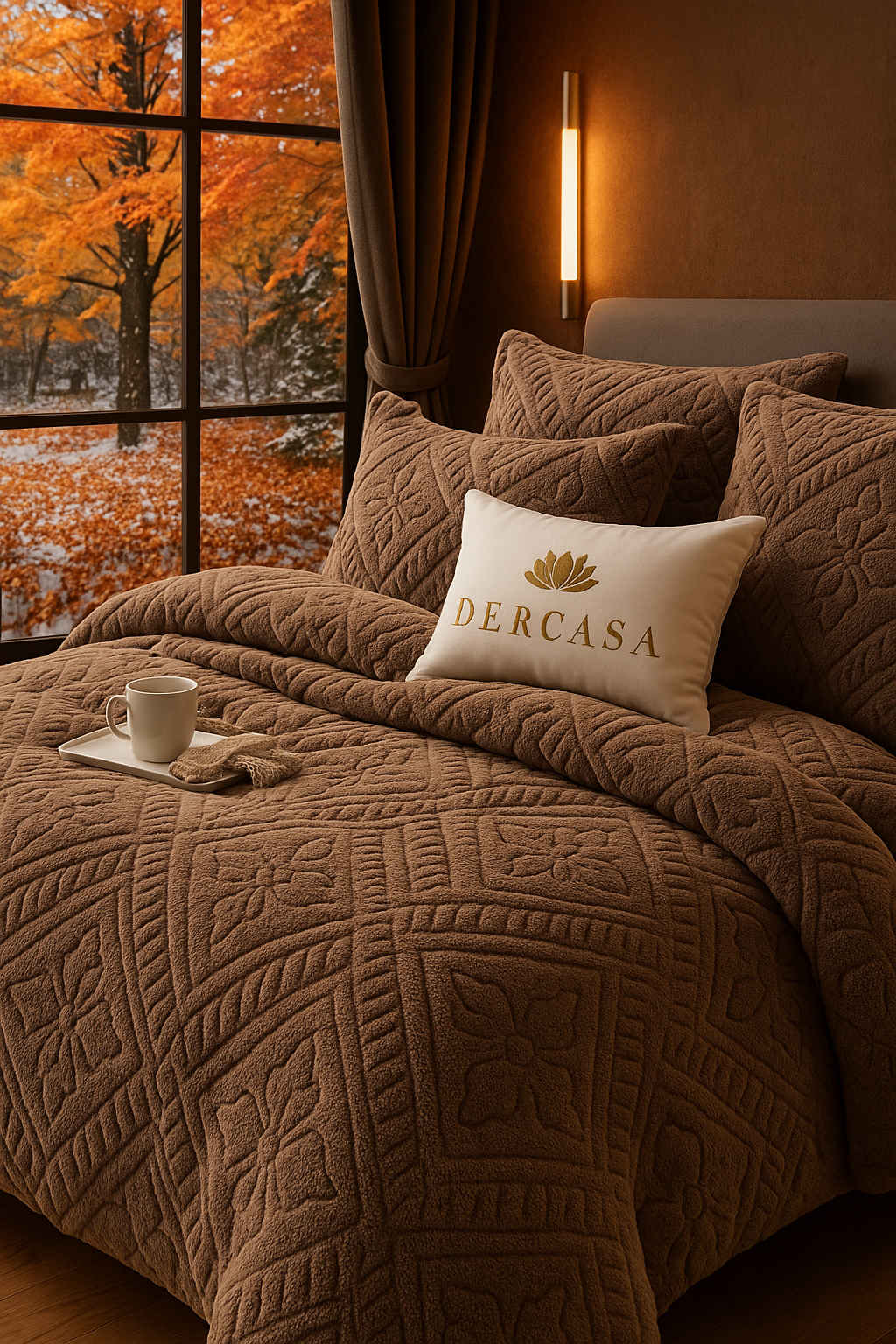Transformă-ți dormitorul într-un spațiu cald și rafinat cu acest set de lenjerie DERCASA, confecționat din materiale moi, plăcute la atingere și cu un design elegant în relief floral. Textura sa catifelată oferă un plus de confort și stil, perfectă pentru serile reci petrecute lângă șemineu.