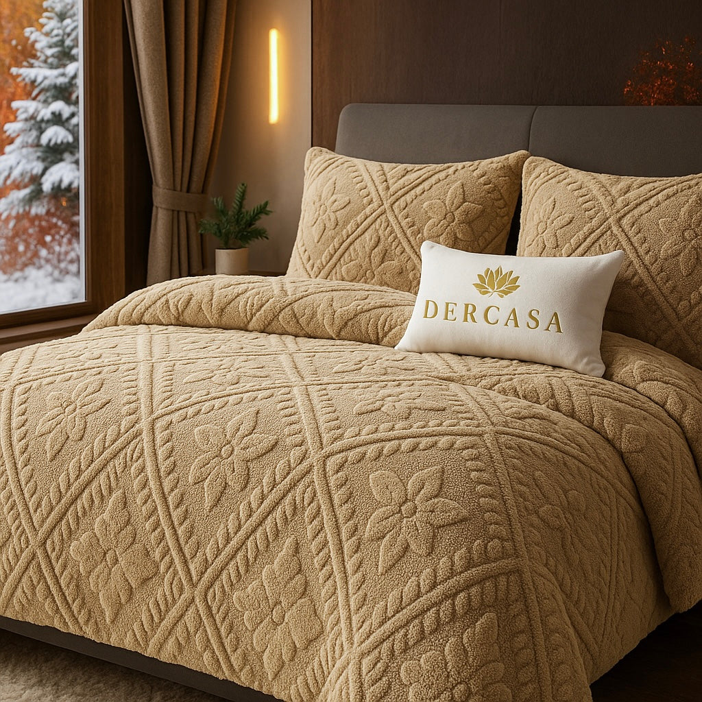Transformă-ți dormitorul într-un spațiu cald și rafinat cu acest set de lenjerie DERCASA, confecționat din materiale moi, plăcute la atingere și cu un design elegant în relief floral. Textura sa catifelată oferă un plus de confort și stil, perfectă pentru serile reci petrecute lângă șemineu.