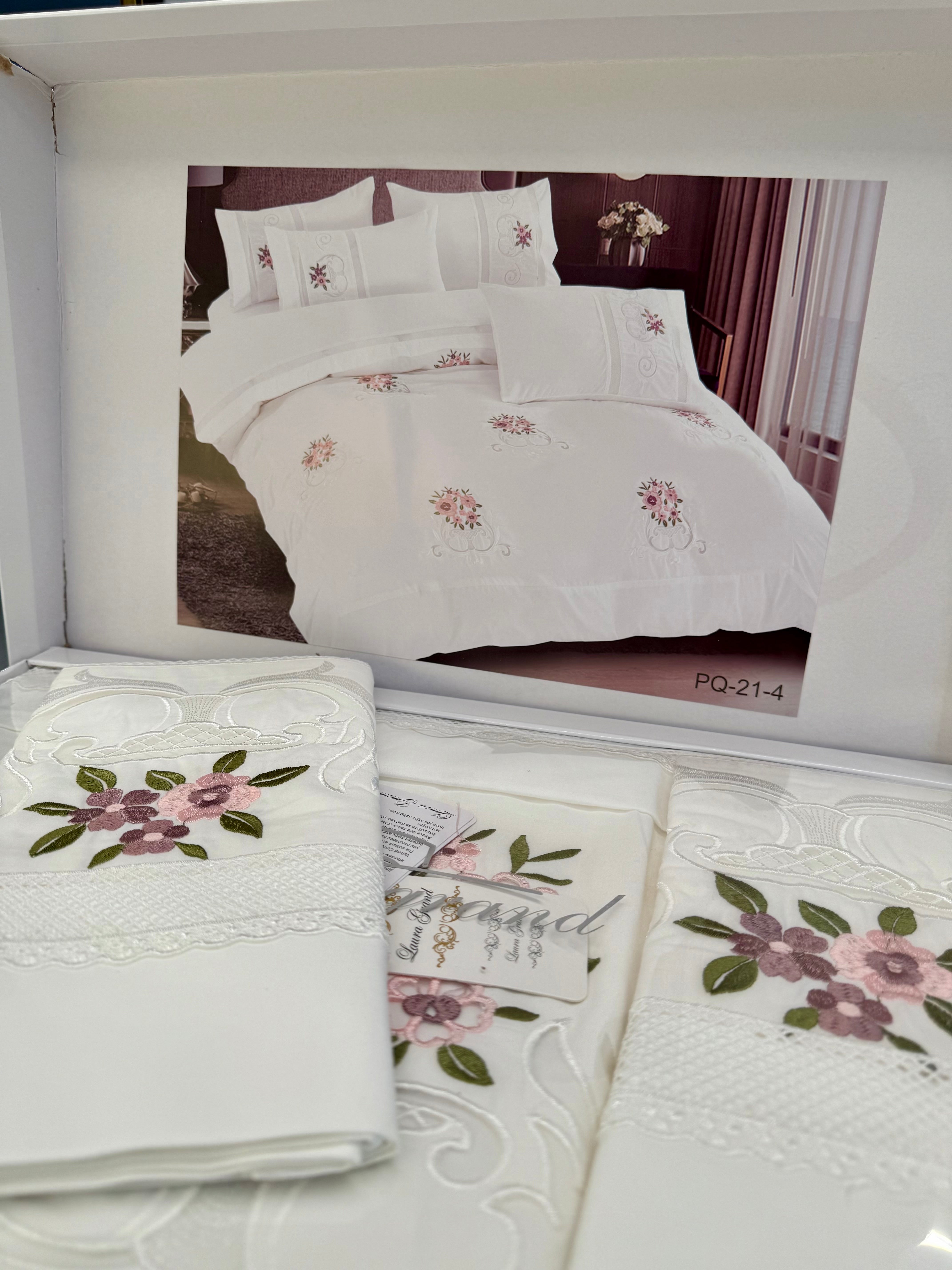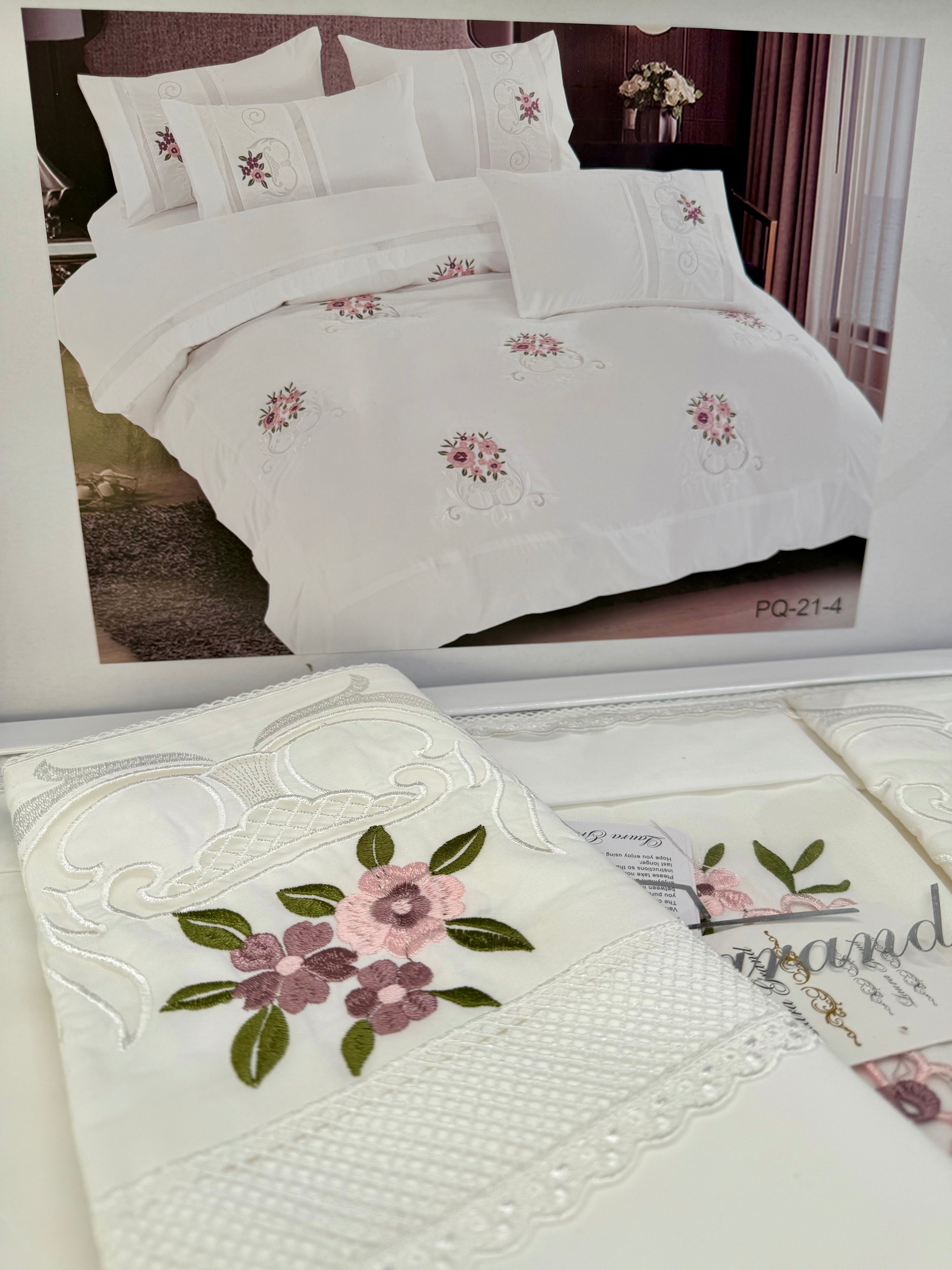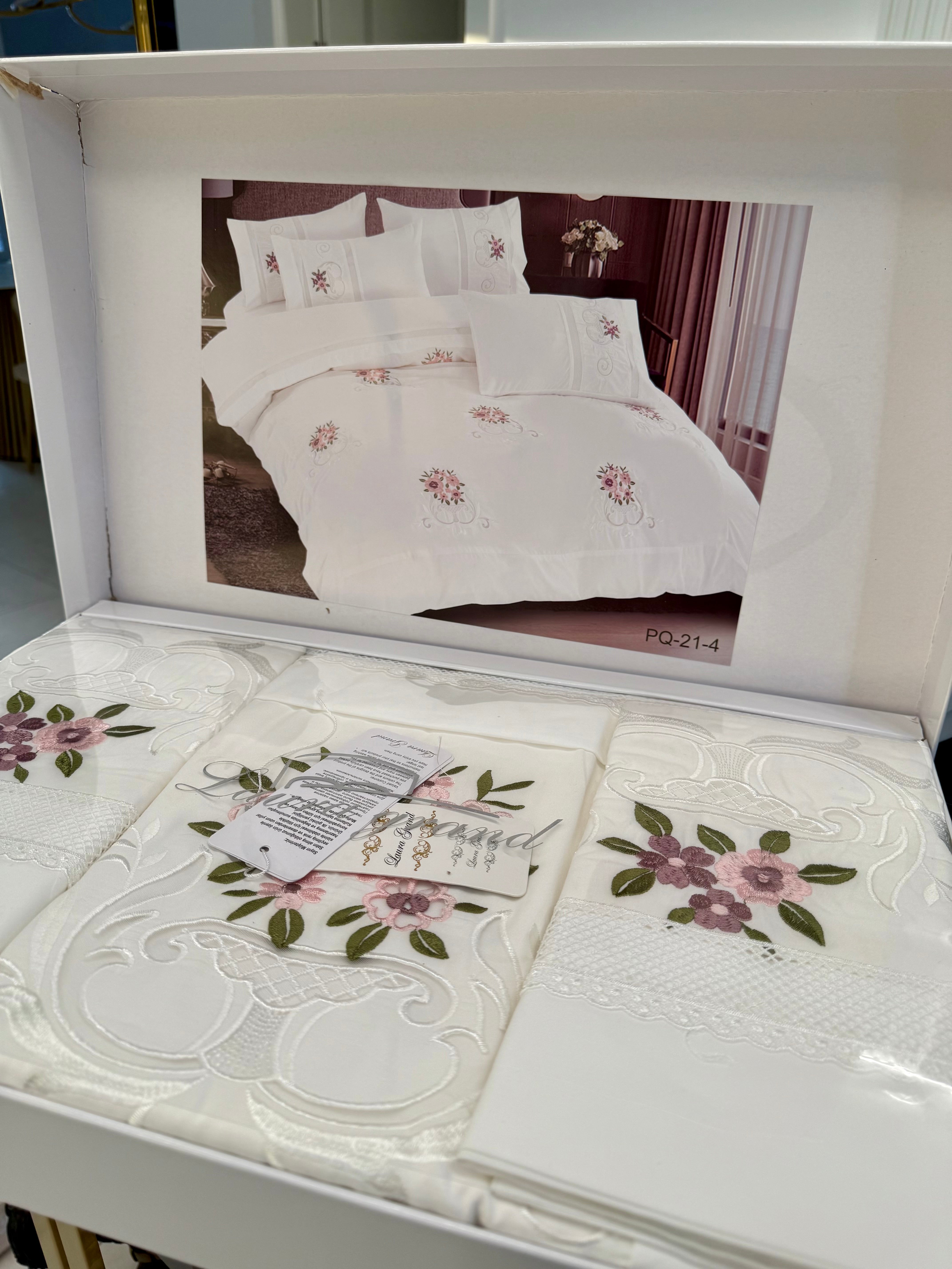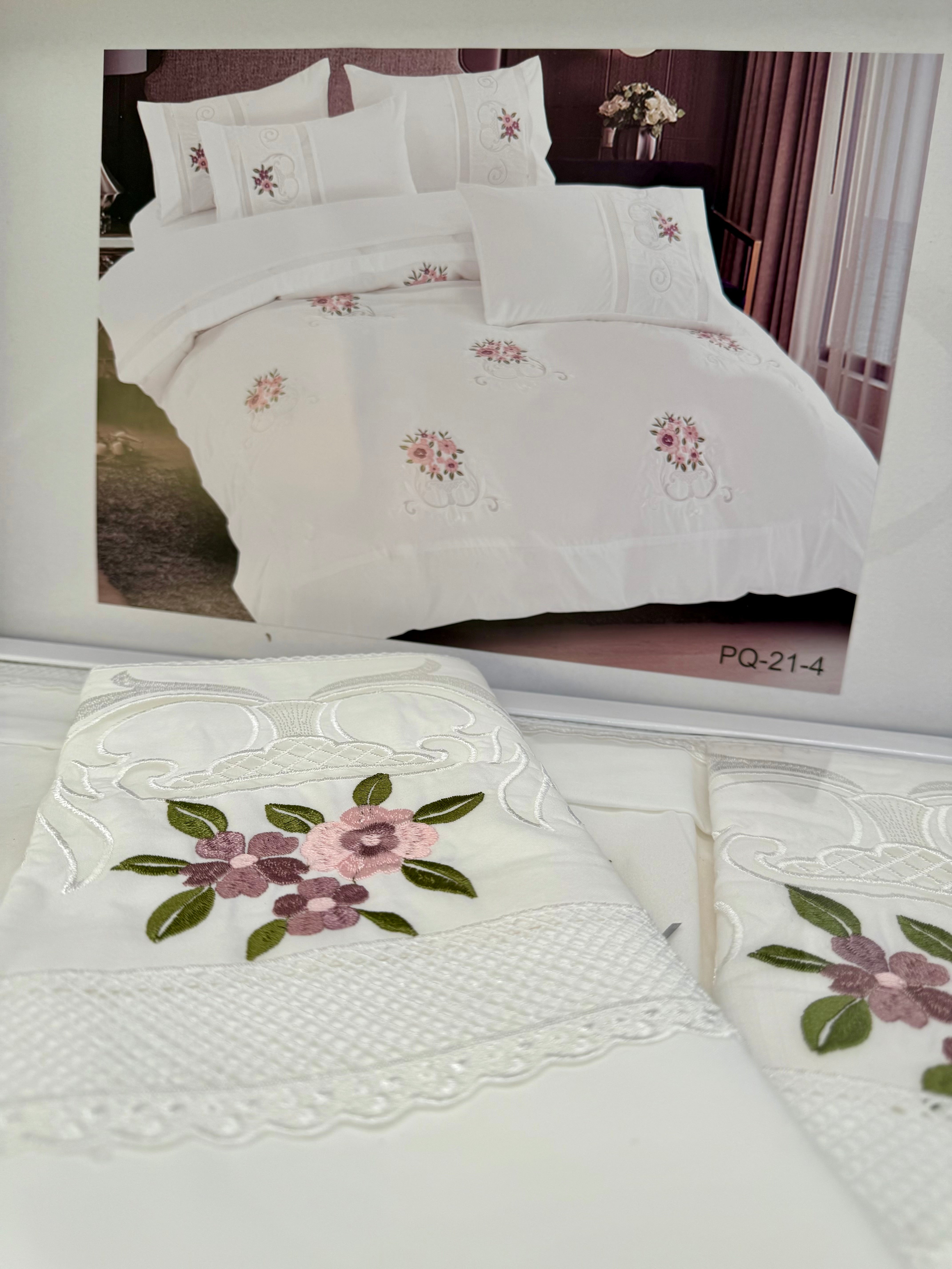 - Broderie florală delicată și dantelă fină aplicate cu grijă pe fețele de pernă și husă