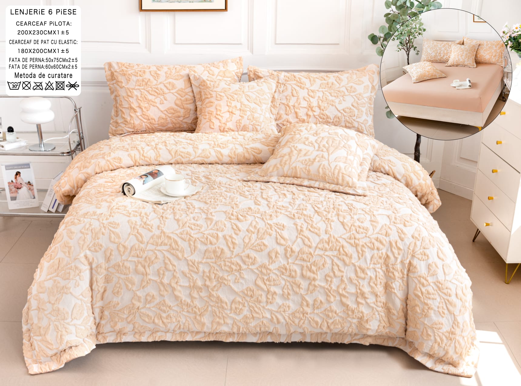 Lenjerie Deluxe Relief, Bumbac+In, grofate, 6 piese, cearșaf cu elastic DRG13
