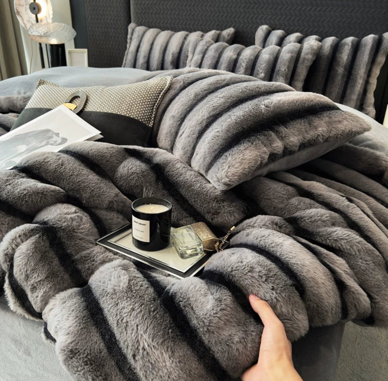 • Set de lenjerie de pat din catifea fleece din blană de iepure artificială de lux, moale, caldă.