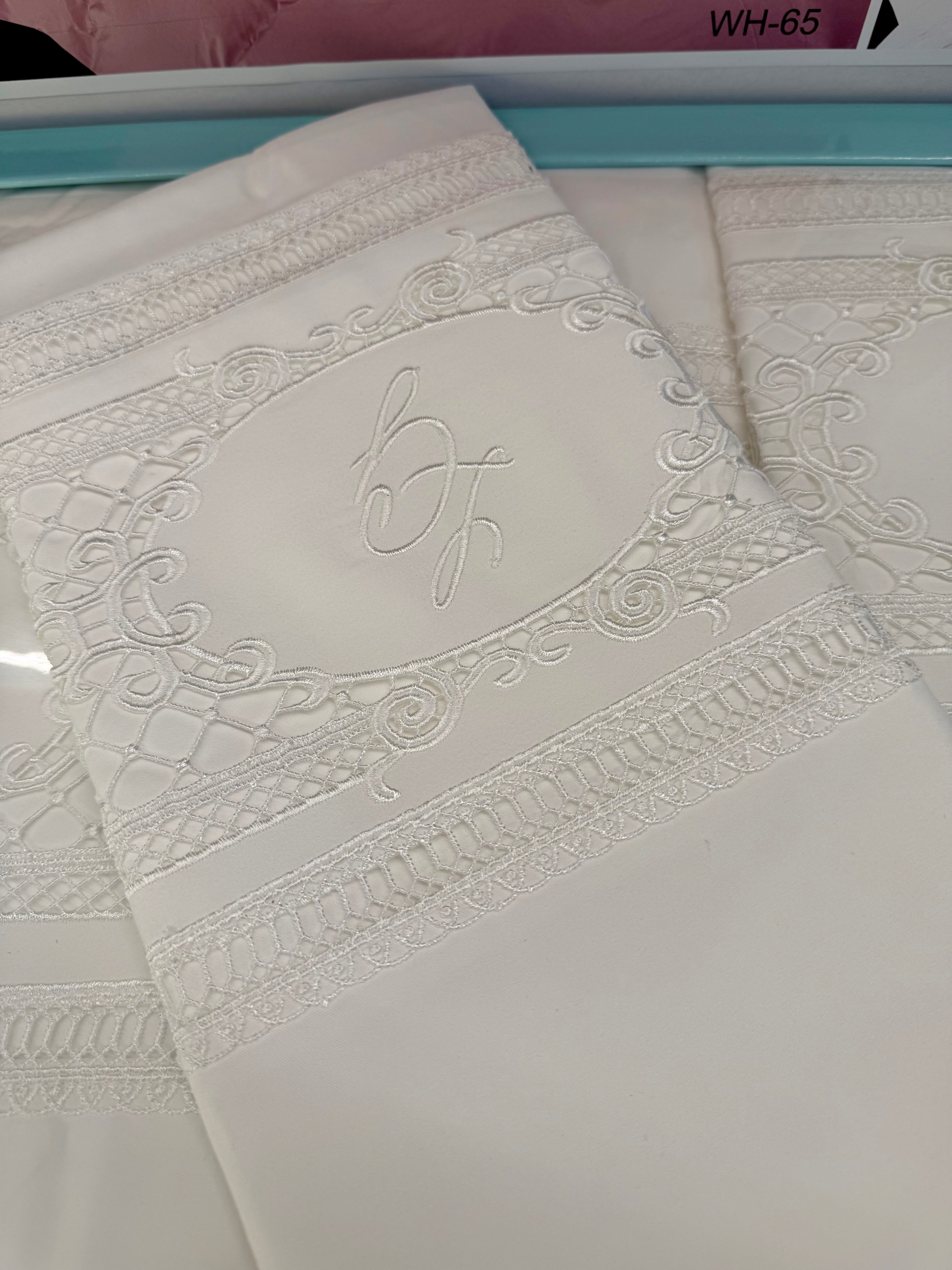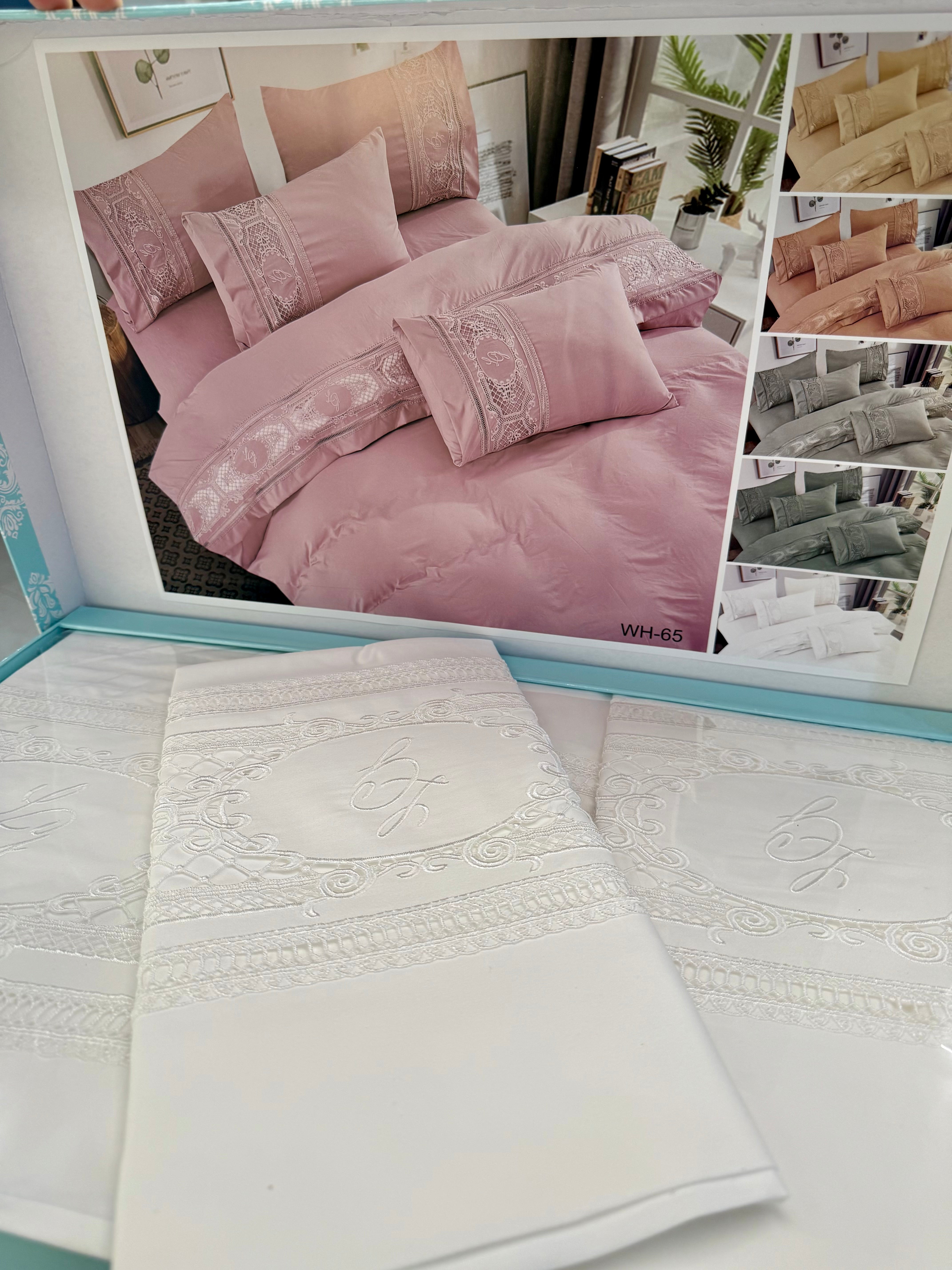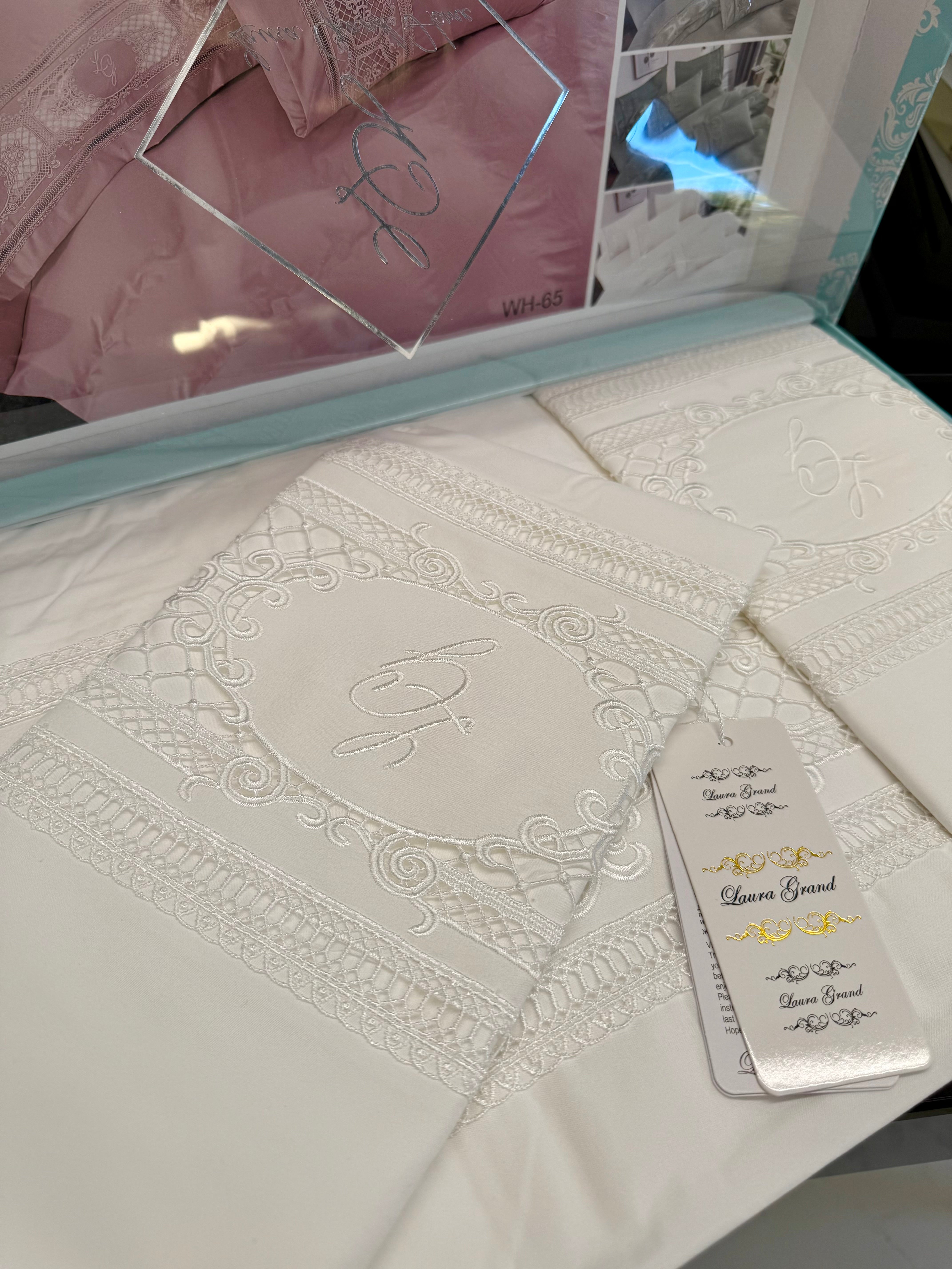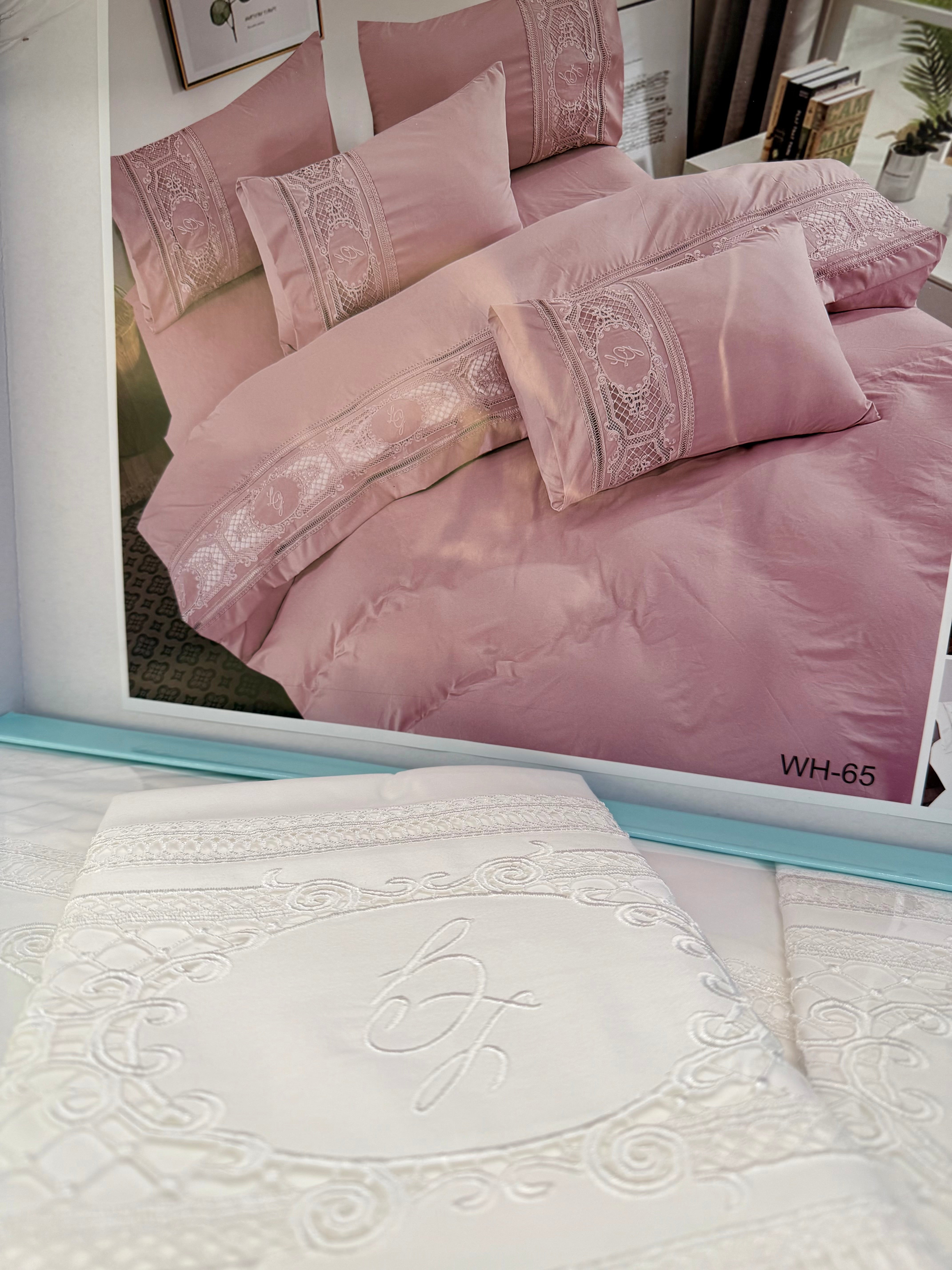 - Broderie delicată și dantelă fină aplicate cu grijă pe fețele de pernă și husă