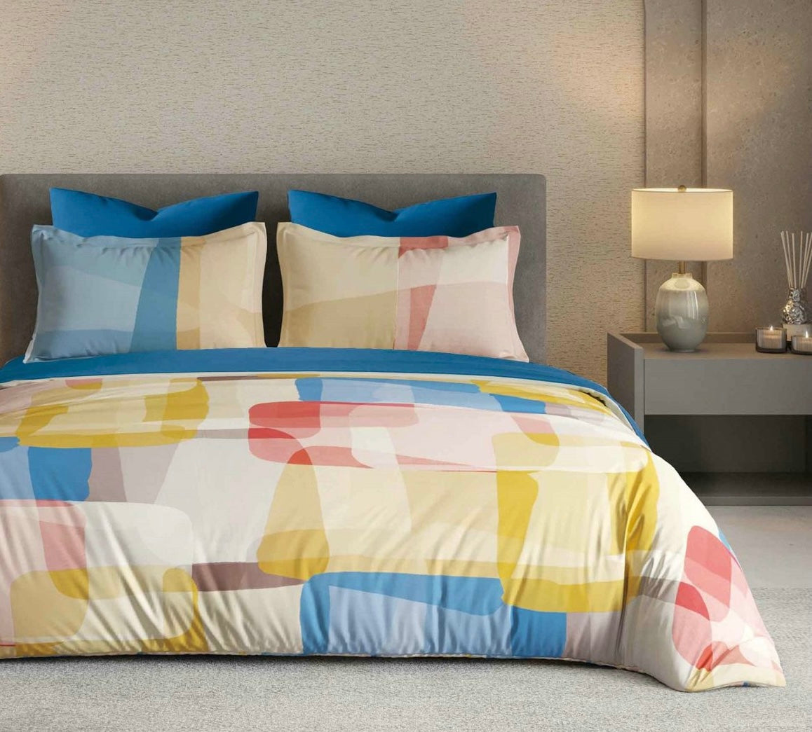 Acest set de lenjerie de pat este realizat din bumbac tip finet premium, asigurând moliciune și respirabilitate excepționale pentru un somn odihnitor. Setul are o paletă liniștitoare de culori pastelate, perfectă pentru a crea o ambianță calmă și liniștită. Împodobită cu modele abstracte elegante, adaugă o notă de sofisticare modernă spațiului tău. Ideal pentru a vă îmbunătăți decorul casei cu o eleganță discretă, acest set de lenjerie de pat este un must-have pentru cei care apreciază atât stilul, cât și confortul.