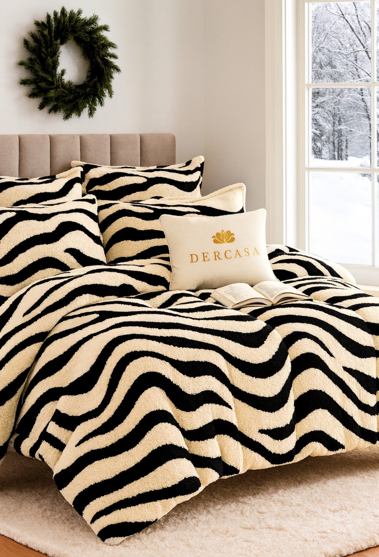 Adaugă un plus de stil și confort dormitorului tău cu această lenjerie de pat din material cocolino plușat, moale, călduroasă și elegantă. Designul cu imprimeu zebra alb-negru oferă o notă modernă și rafinată, perfectă pentru orice decor.