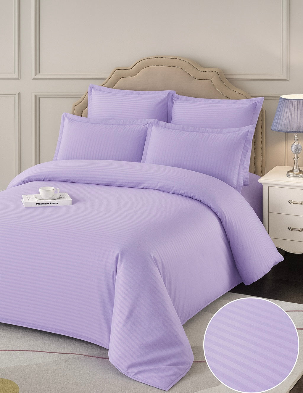 Lenjerie de pat dublu din damasc finetat, linear (tesatura imprimata, cu dunga de 1 cm grosime), confectionata din bumbac 100%, cu 6 piese, folosita cel mai mult in regimul hotelier, datorita simplitatii si calitatii extraordinare. Materialul are un aspect mat pentru o nota de eleganta si rafinament, datorita tesaturii speciale. Damascul este recunoscut pentru rezistenta sa in timp la nenumarate spalari, nemodificandu-si aspectul.
