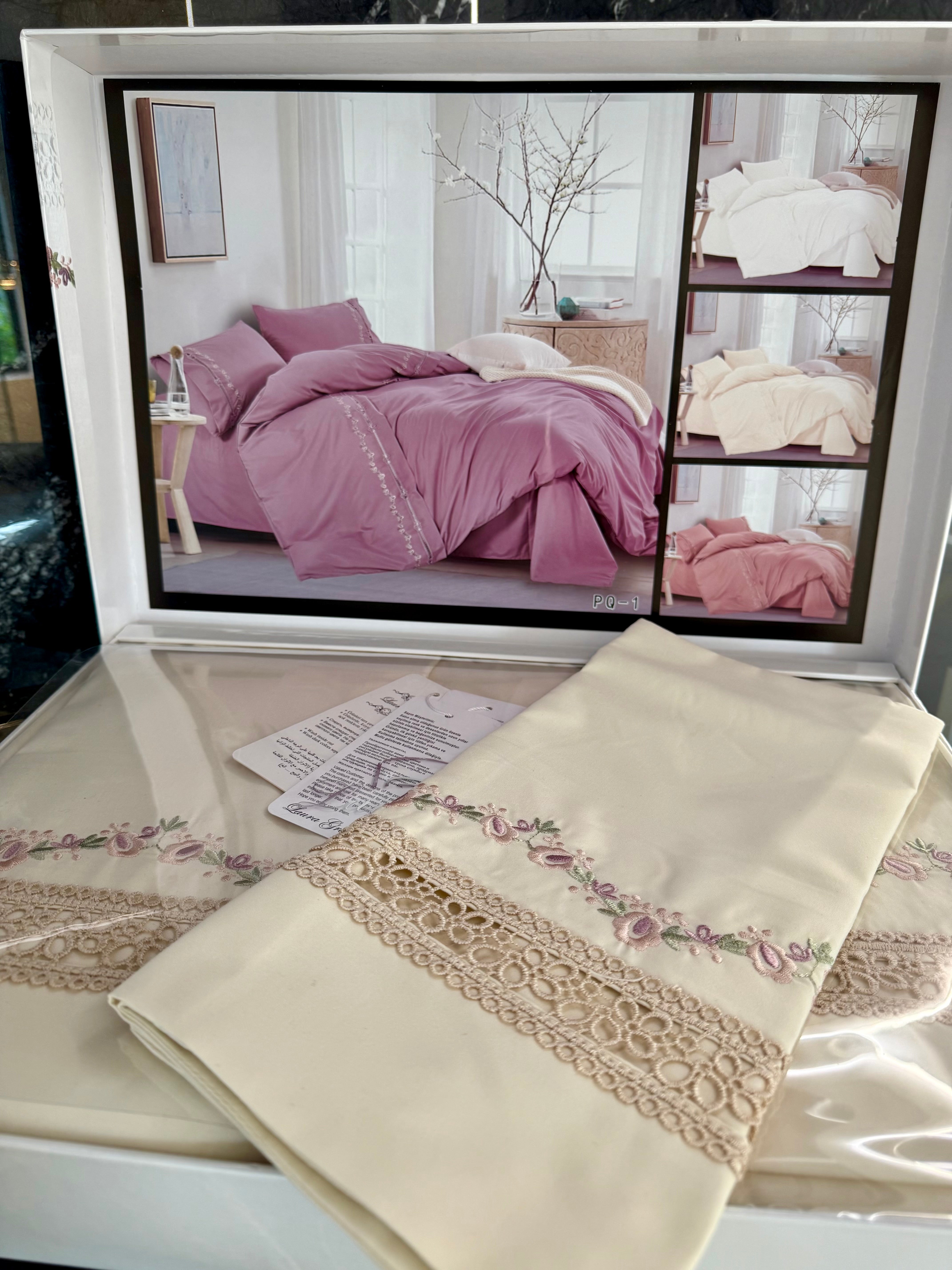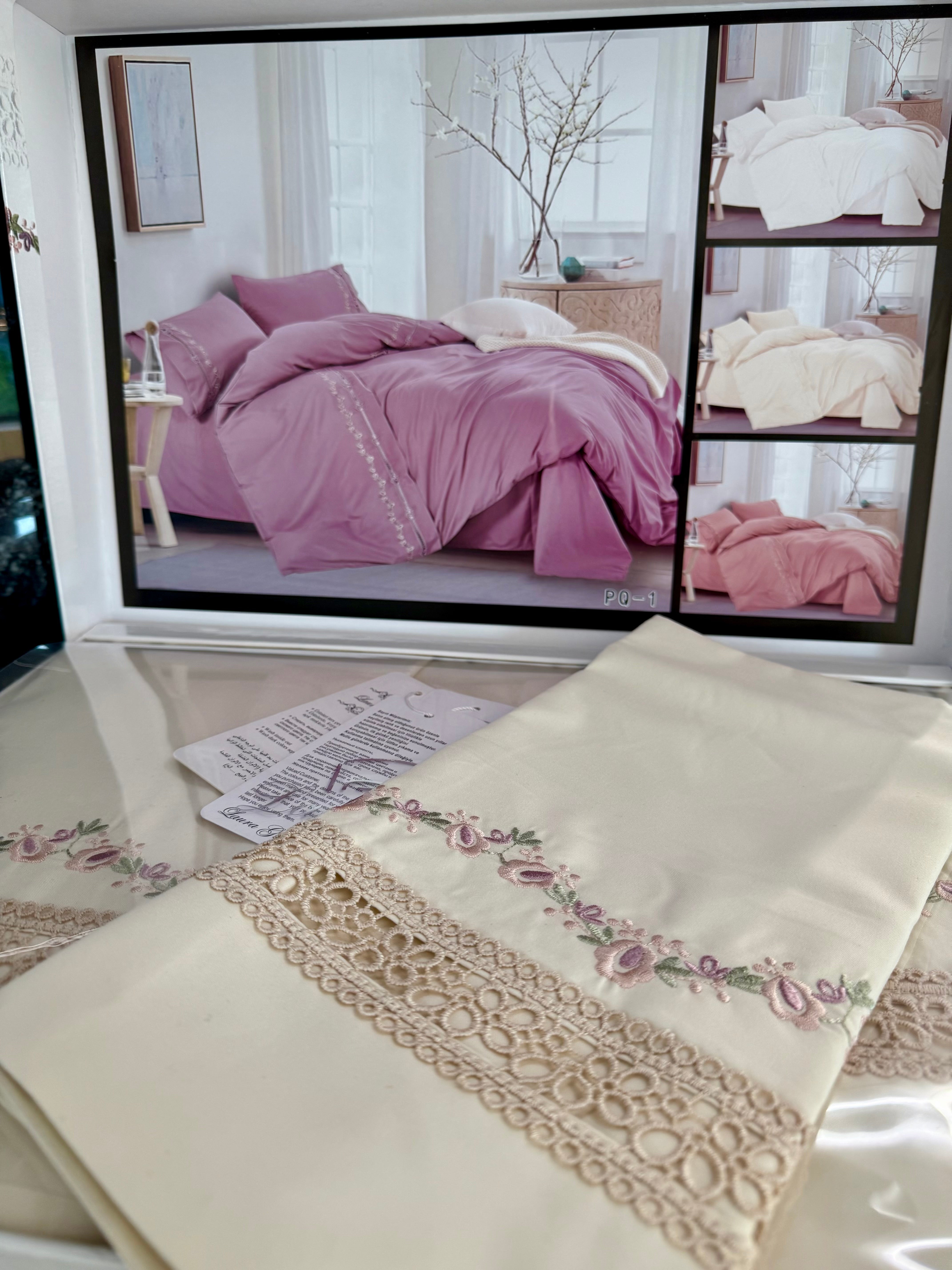 - Broderie florală delicată și dantelă fină aplicate cu grijă pe fețele de pernă și husă