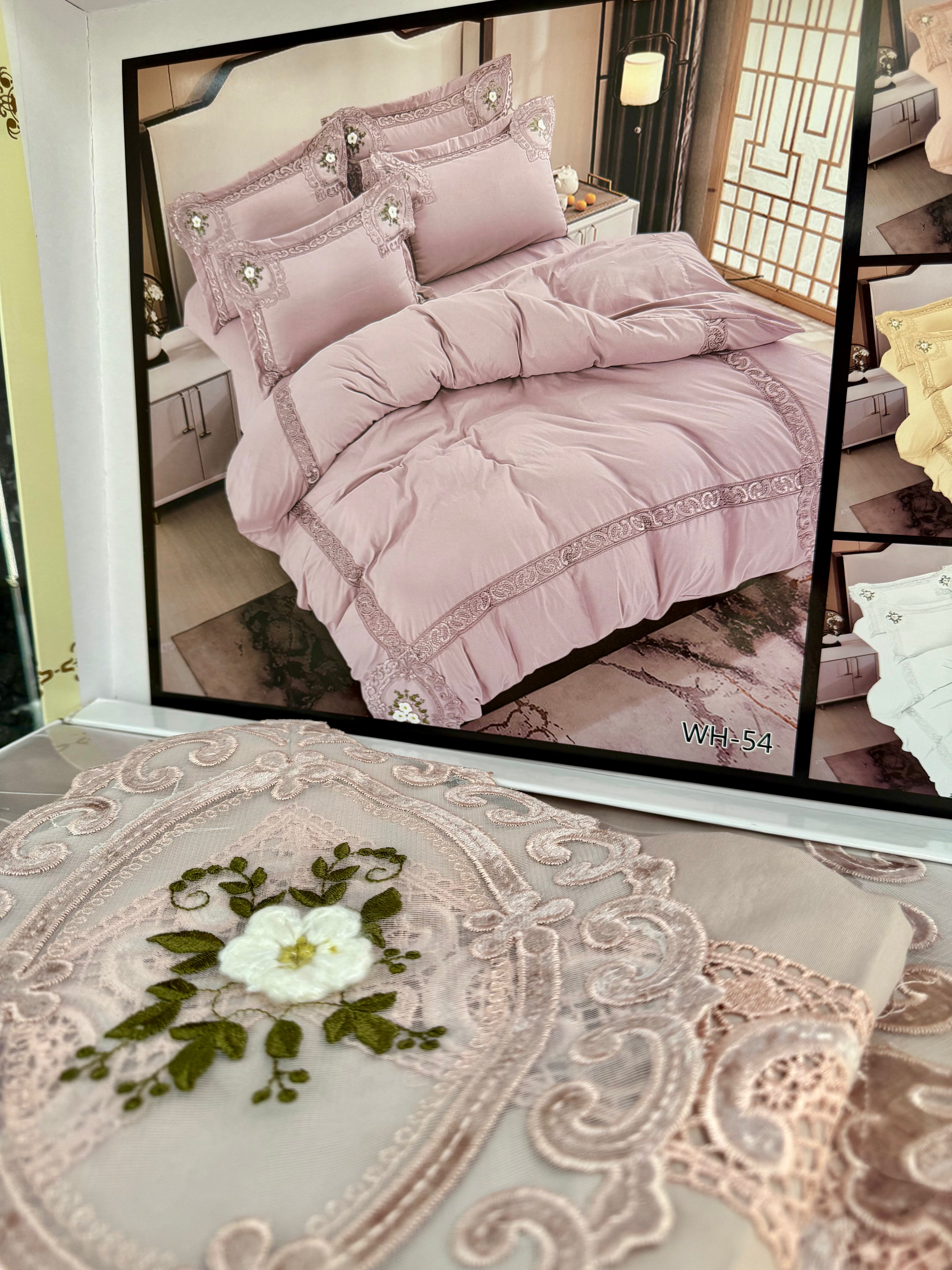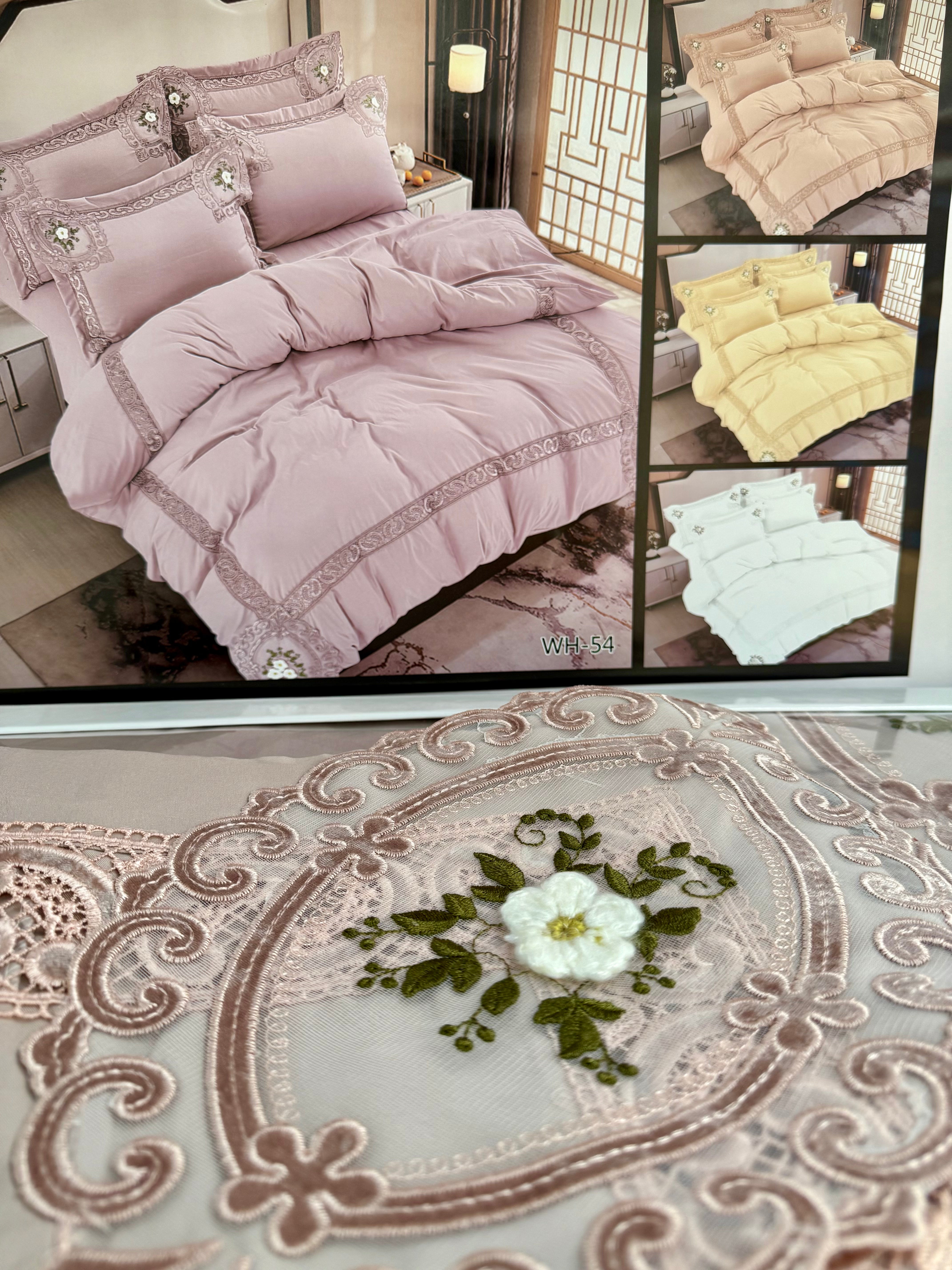 - Broderie florală delicată și dantelă fină aplicate cu grijă pe fețele de pernă și husă